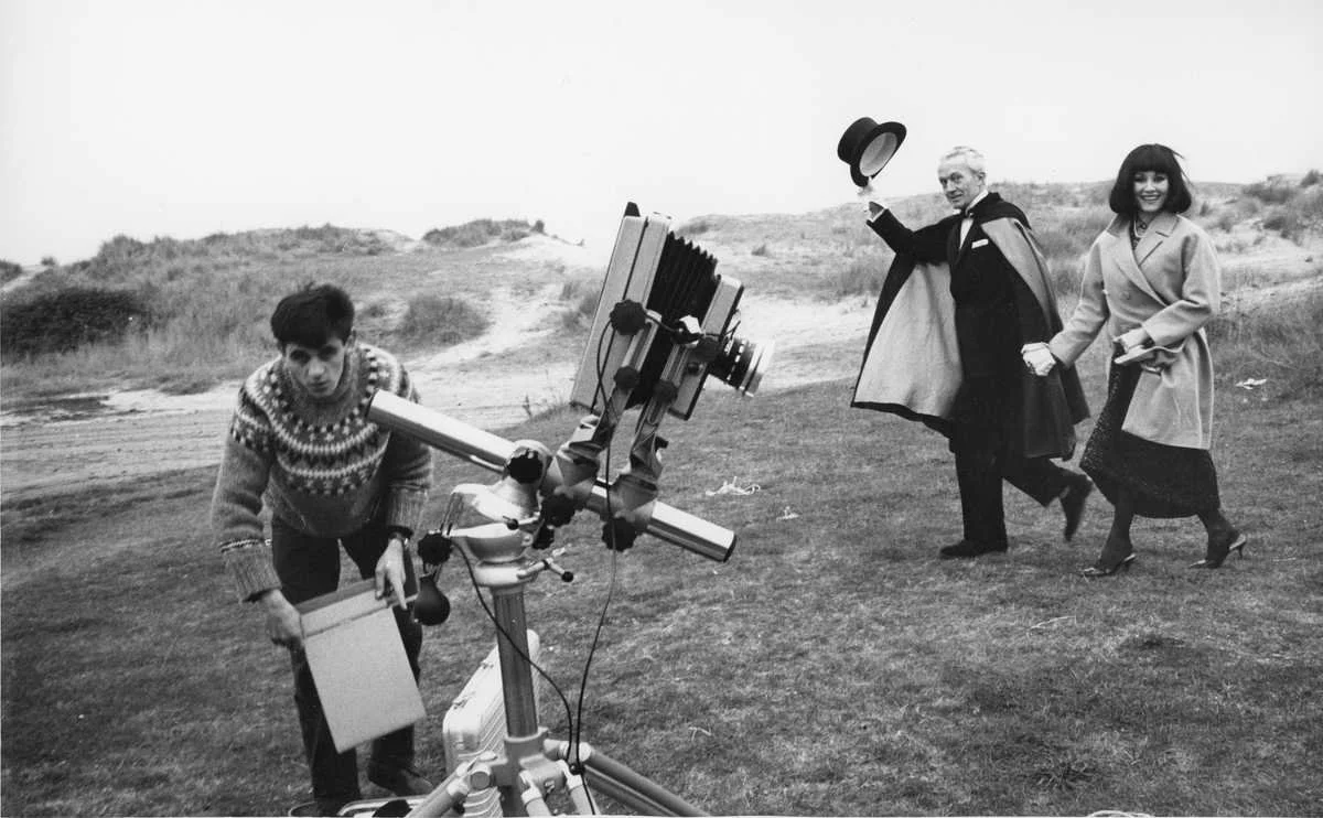 On fait rentrer dans ma petite cour du 7 rue Hoche la belle Rolls-Royce, et ça c’est déjà un travail. On tend derrière la voiture pour faire un fond noir, une grande tenture louée aux pompes funèbres, et installée par eux. Je dessine sur le verre dépoli de la Kardan avec un crayon gras la silhouette de la voiture. La voiture est éclairée par des flash Balcar avec des lampes pilotes. Après avoir déterminé le diaphragme grâce à la cellule, on fait plusieurs Ekta 20x25. Par sécurité, je fais un tirage en noir et blanc, qui peut être développé sur place, afin de m’assurer de mon exposition. J’ai toujours fiat ainsi des vérifications intermédiaires, alors que j’étais très sûr de moi et de mes réglages. Puis on retourne au studio, et devant la Kardan, on fait poser les personnages en fonction de la silhouette de la voiture, pour composer la photo, et on dessine leur silhouette et expose plusieurs Ekta sur lesquels figure déjà la voiture.